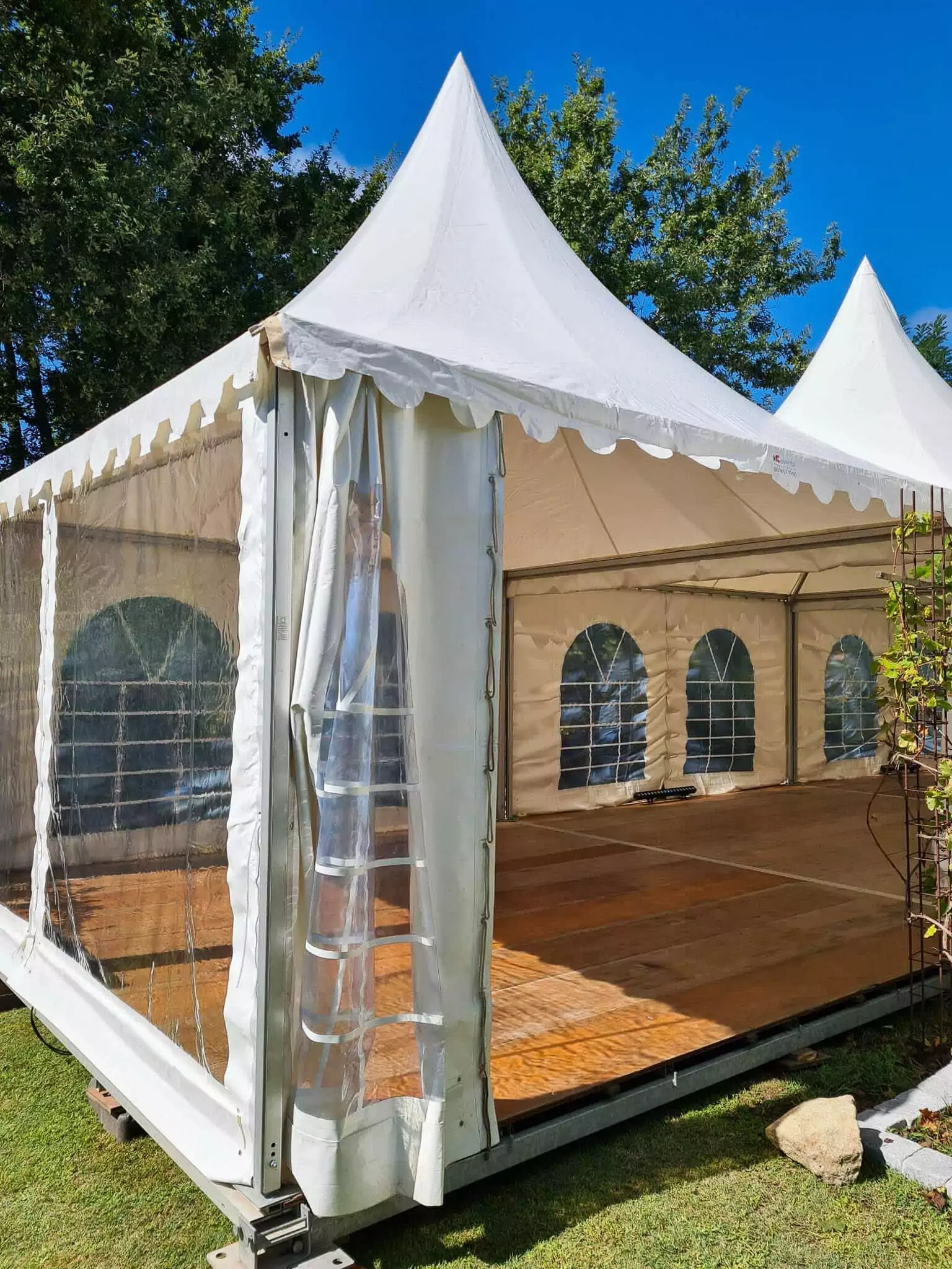 Nos tentes cottage, avec leurs toits pointus rappelant des « chapeaux chinois », offrent une structure à la fois raffinée et élégante. Parfaits pour apporter du charme à vos réceptions, nos cottages sont disponibles en différentes tailles, comme 3 x 5 m ou 5 x 5 m, pour s’adapter parfaitement à l’espace disponible et au nombre d’invités.